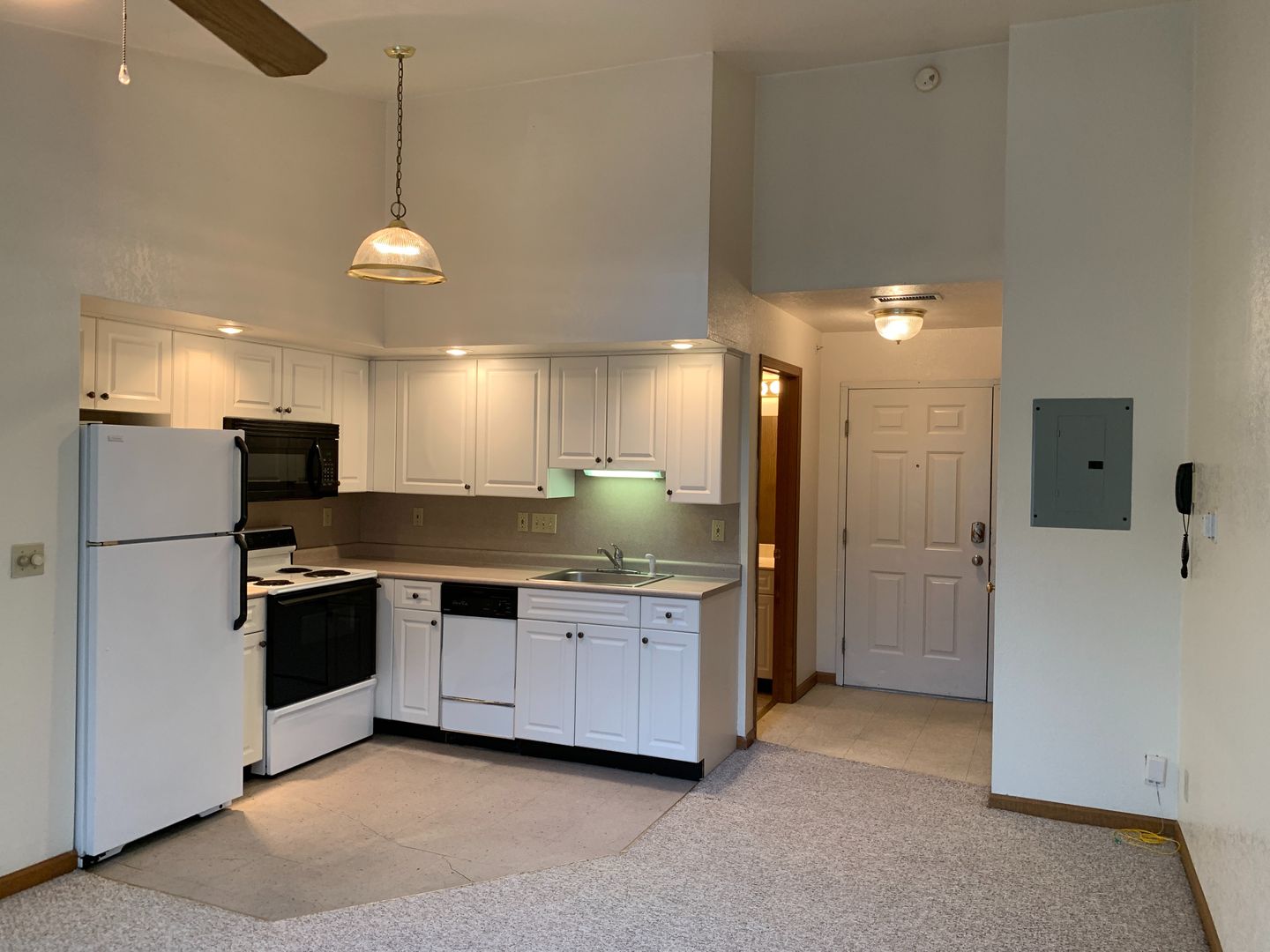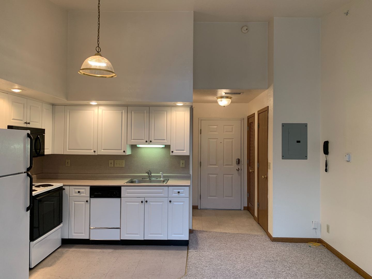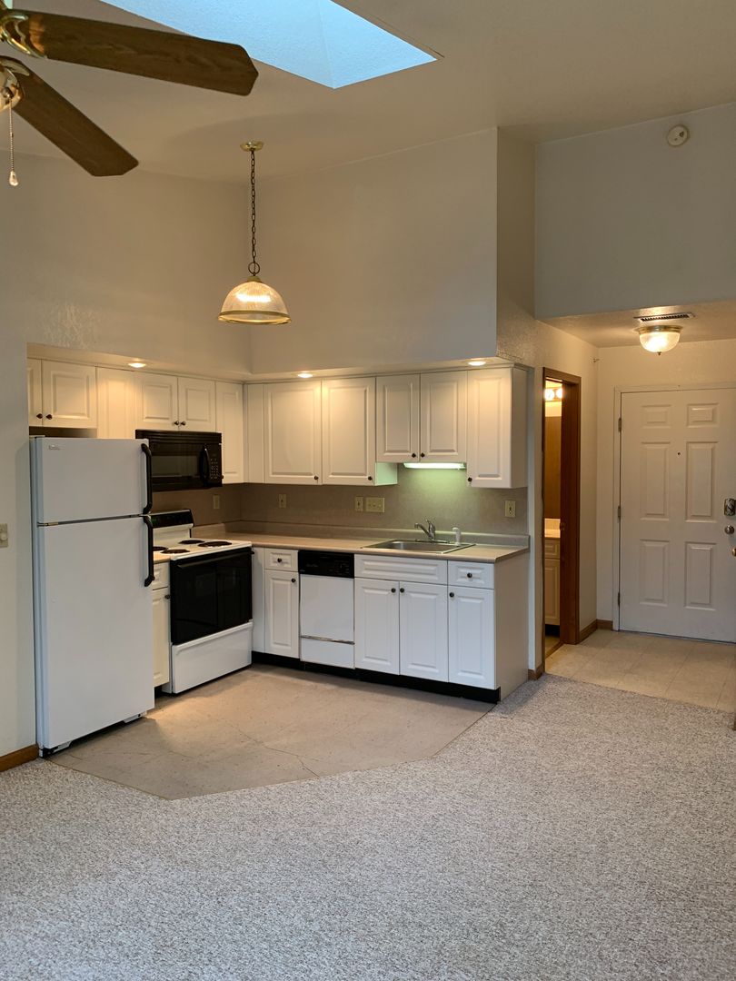 This unit features a well-designed kitchen with a full size stove, fridge, dishwasher, and built in microwave! It is spacious, has a full size bath, and a balcony! This unit has vaulted ceilings and a skylight!