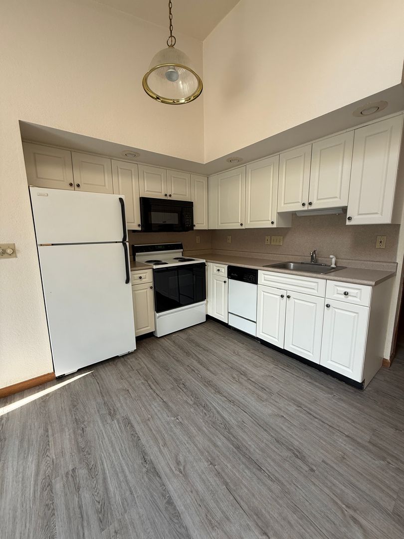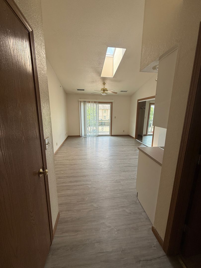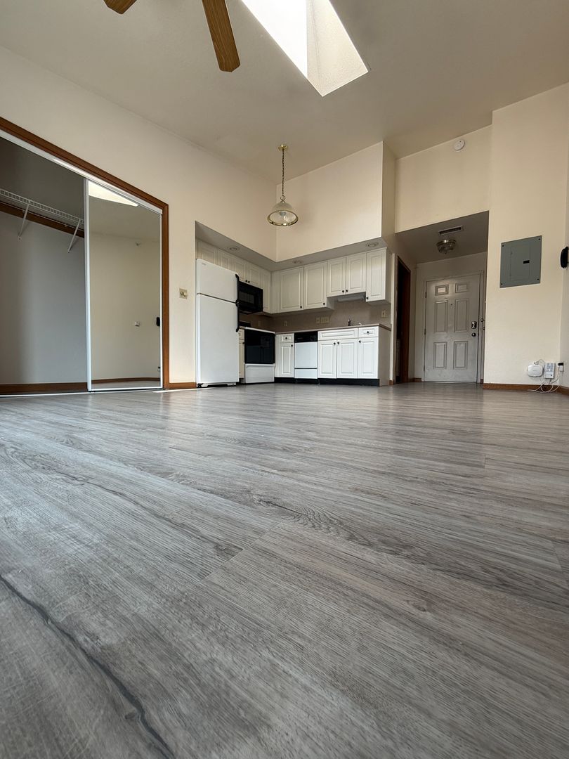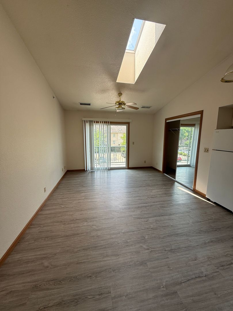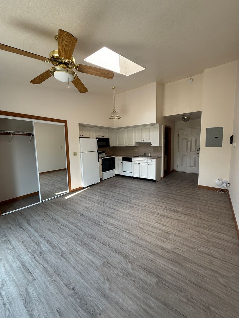This unit features a well-designed kitchen with a full size stove, fridge, dishwasher, and built in microwave! It is spacious, has a full size bath, and a balcony! This unit has vaulted ceilings and a skylight!