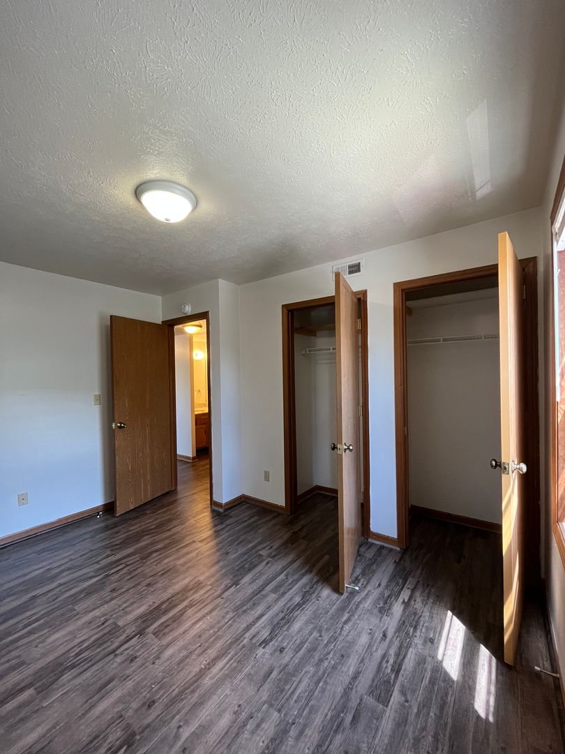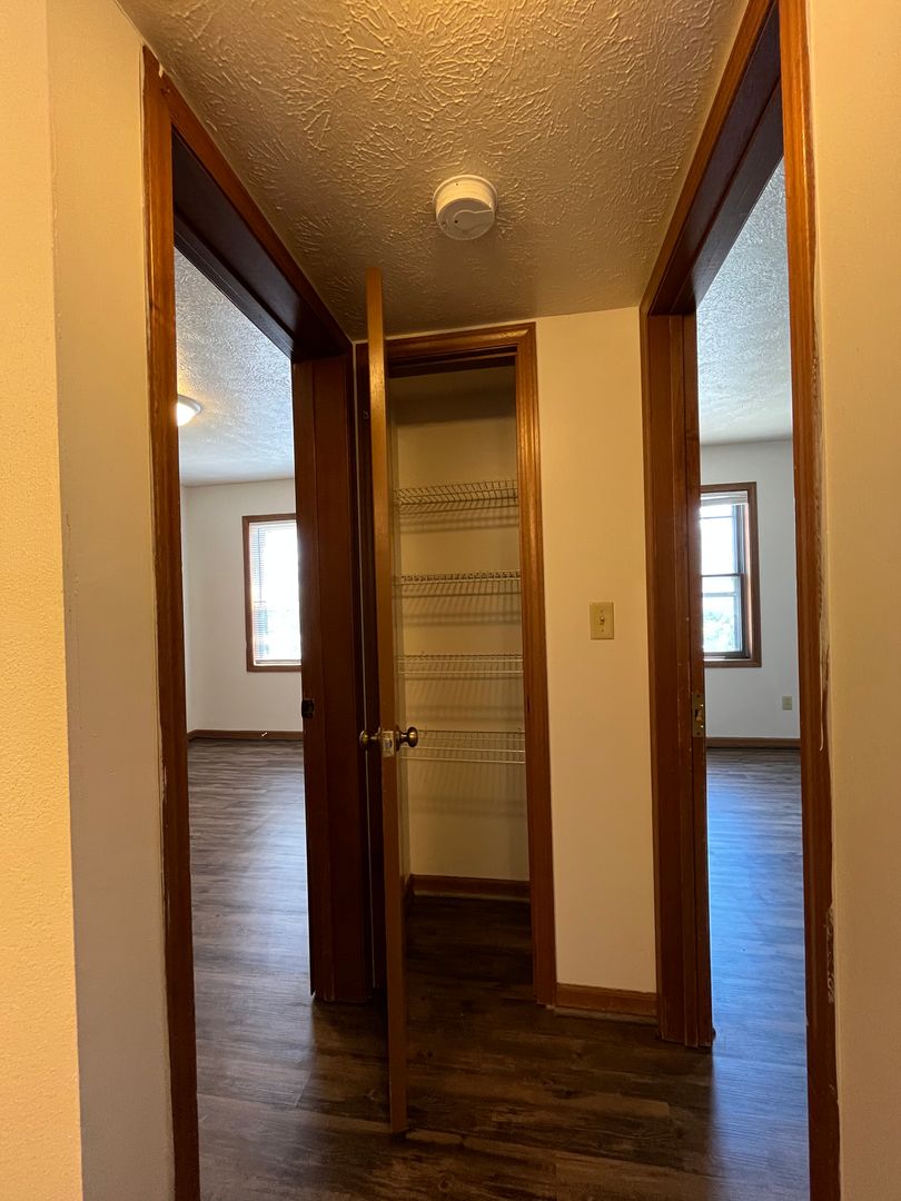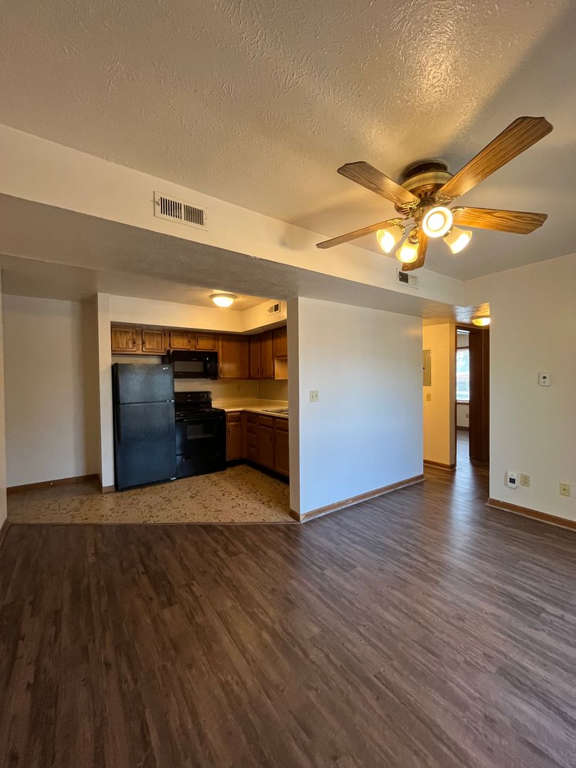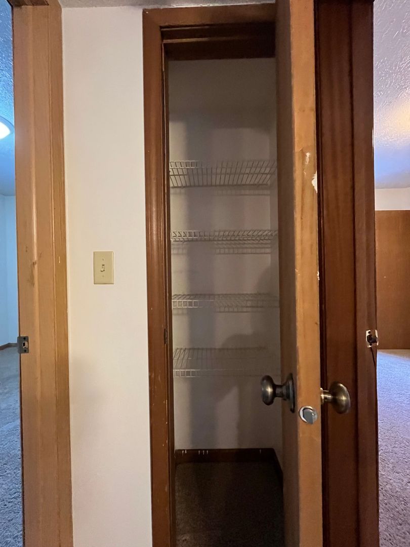 This two bed one bath unit has a fully equipped kitchen, spacious living room, and large storage closet.