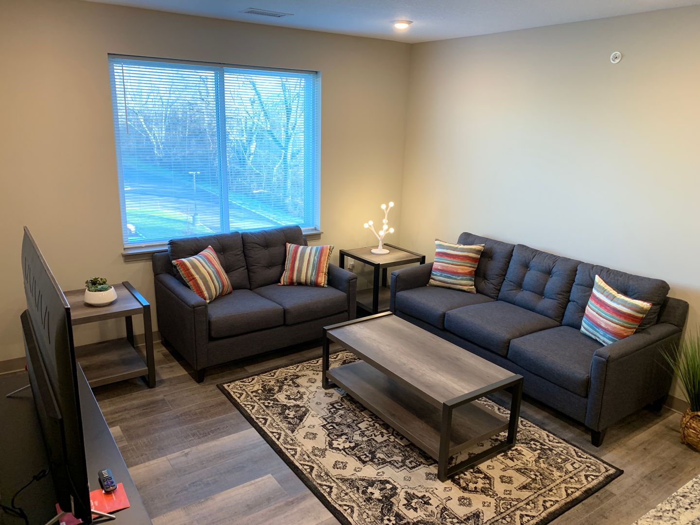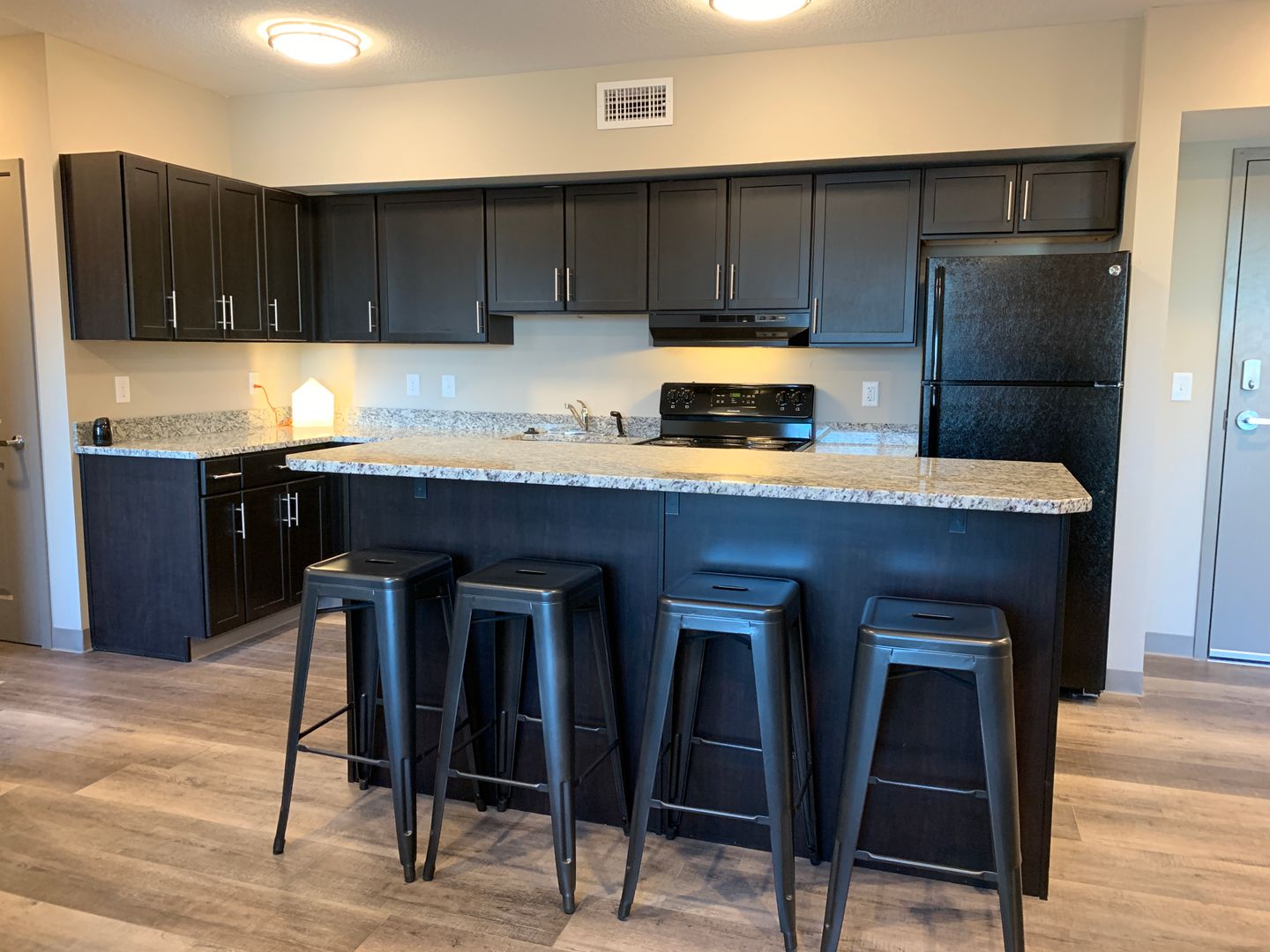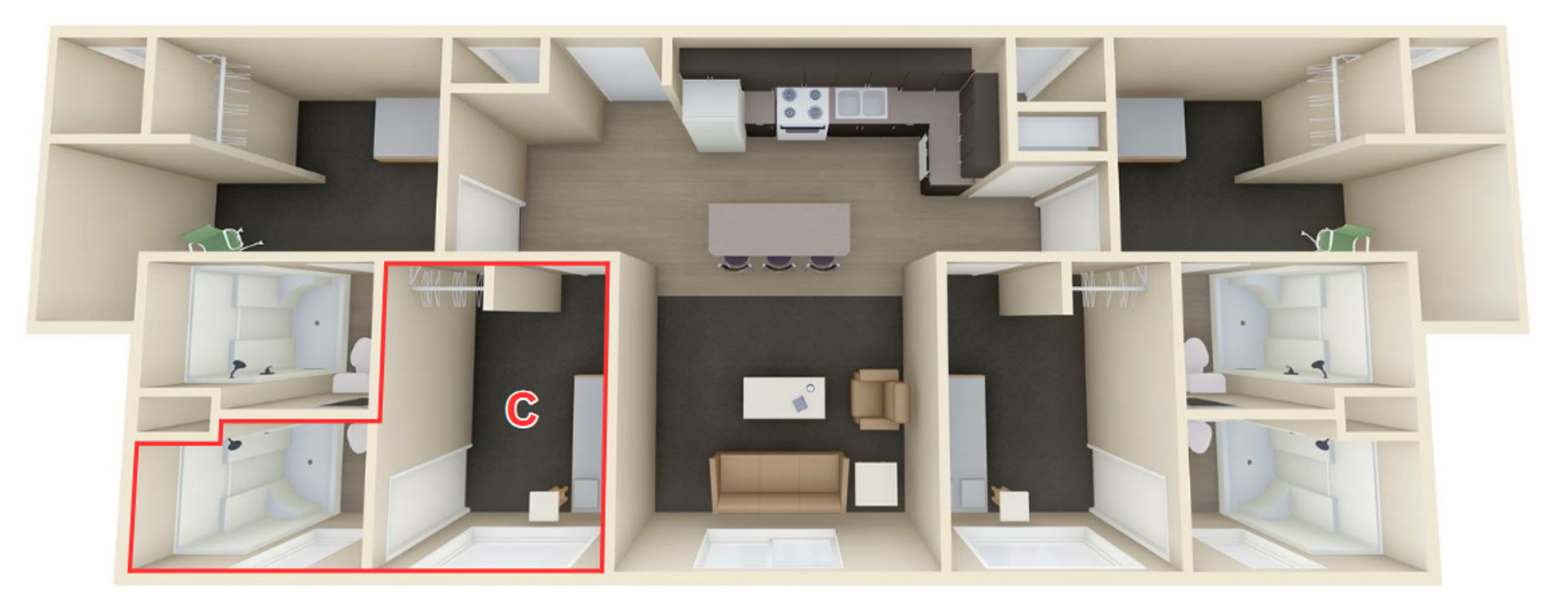 Enjoy your private bedroom & bathroom in the Quad! Upon entering, you will be impressed with the modern features and a completely furnished common area. Kitchens are fully equipped with electric range-oven, dishwasher, fridge, and garbage disposal. Furnishing includes a full bed and bed frame, under-bed storage, sofa/couch, a 55” smart TV, and other furnishings.