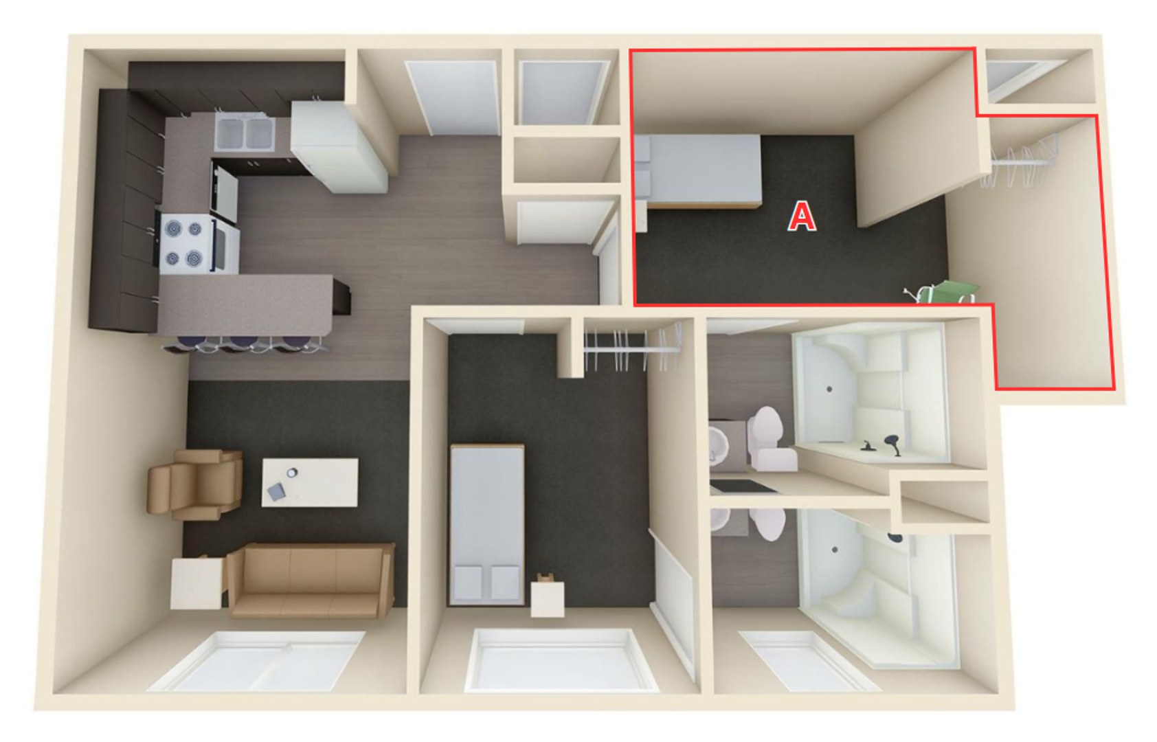 Enjoy your private bedroom & bathroom in the Duo! Upon entering, you will be impressed with the modern features and a completely furnished common area. Kitchens are fully equipped with electric range-oven, dishwasher, fridge, and garbage disposal. Furnishing includes a full bed and bed frame, under-bed storage, sofa/couch, a 55” smart TV, and other furnishings.