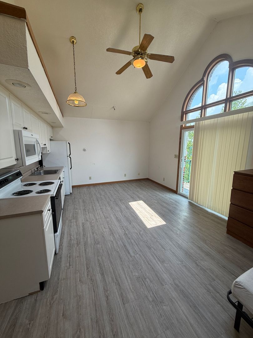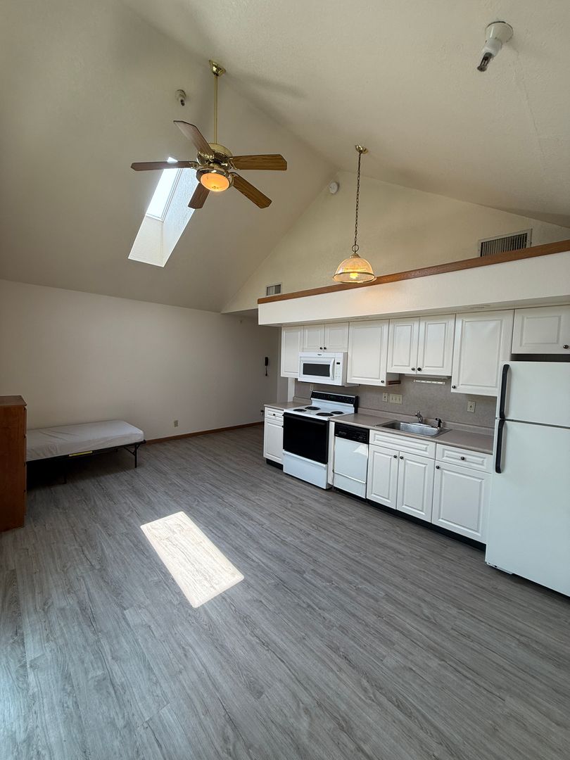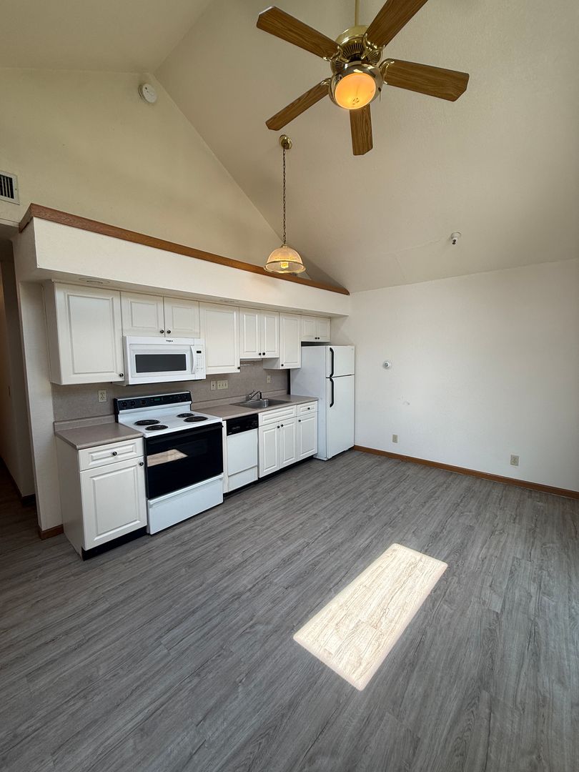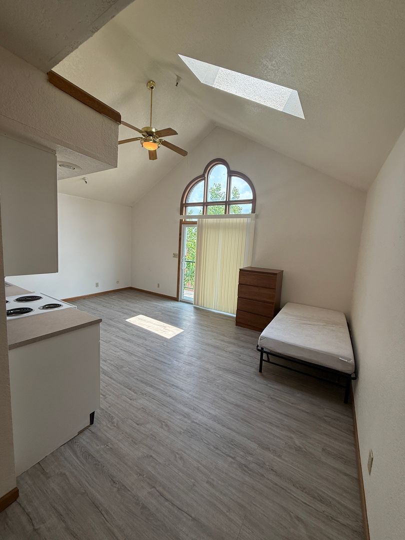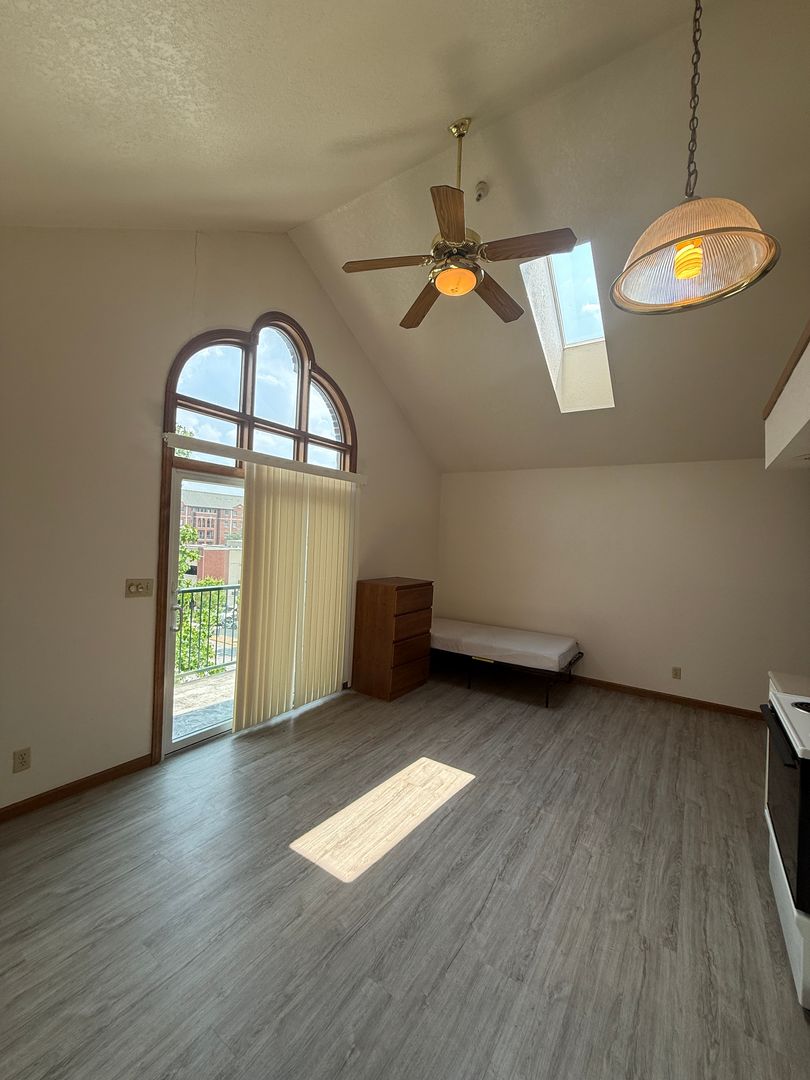 This unit features a well-designed kitchen with a full size stove, fridge, dishwasher, and built in microwave! It is spacious, has a full size bath, and a balcony!