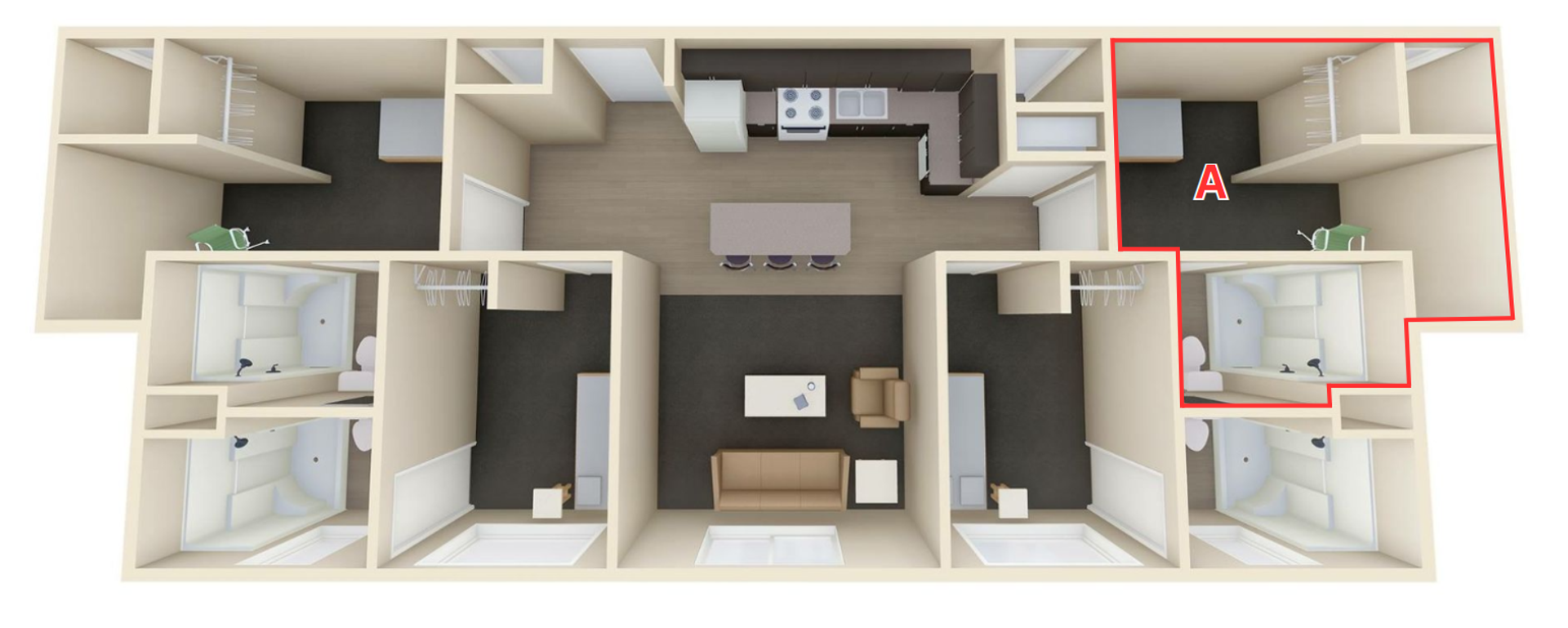 Enjoy your private bedroom & bathroom in the Quad! Upon entering, you will be impressed with the modern features and a completely furnished common area. Kitchens are fully equipped with electric range-oven, dishwasher, fridge, and garbage disposal. Furnishing includes a full bed and bed frame, under-bed storage, sofa/couch, a 55” smart TV, and other furnishings.