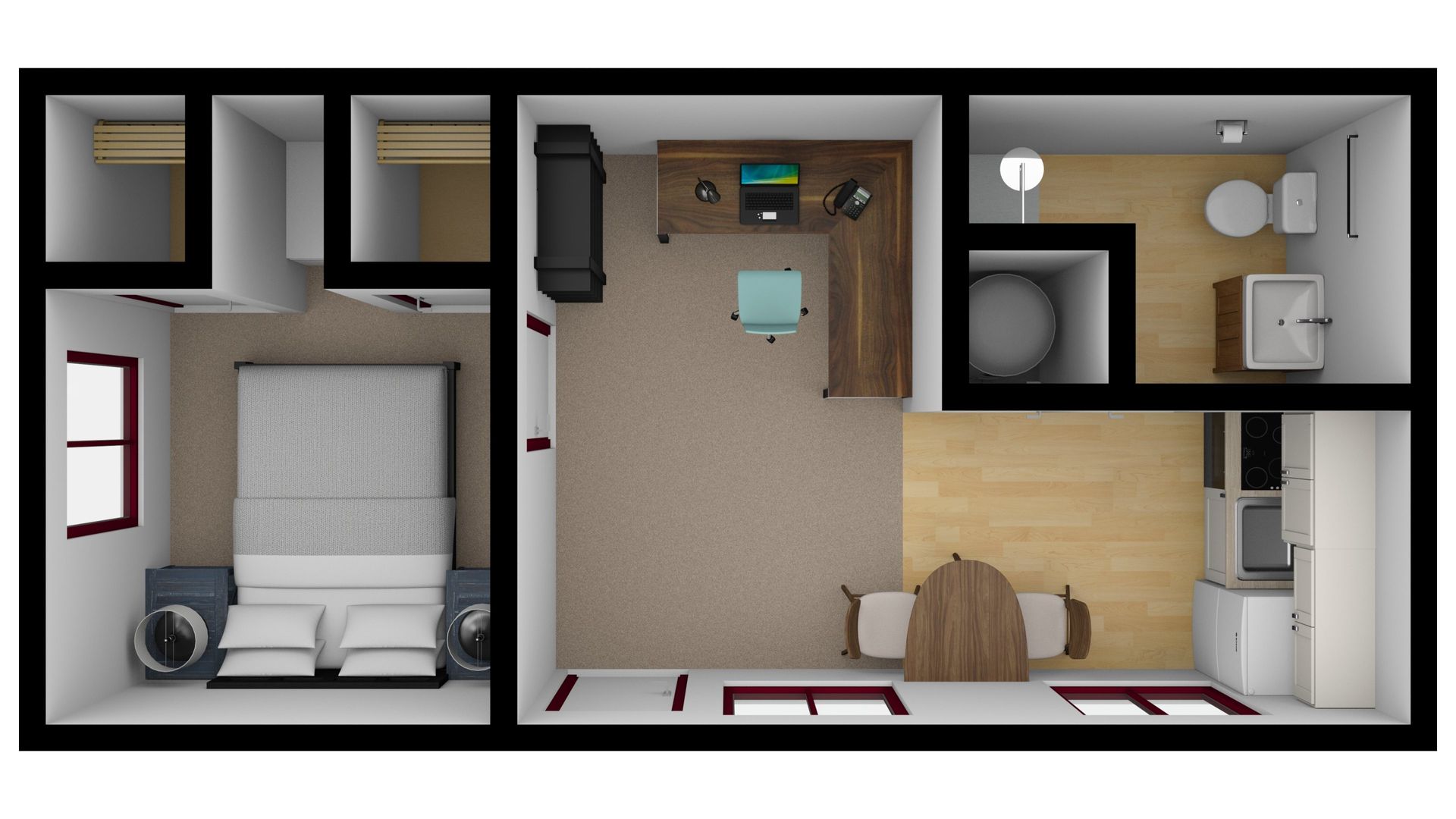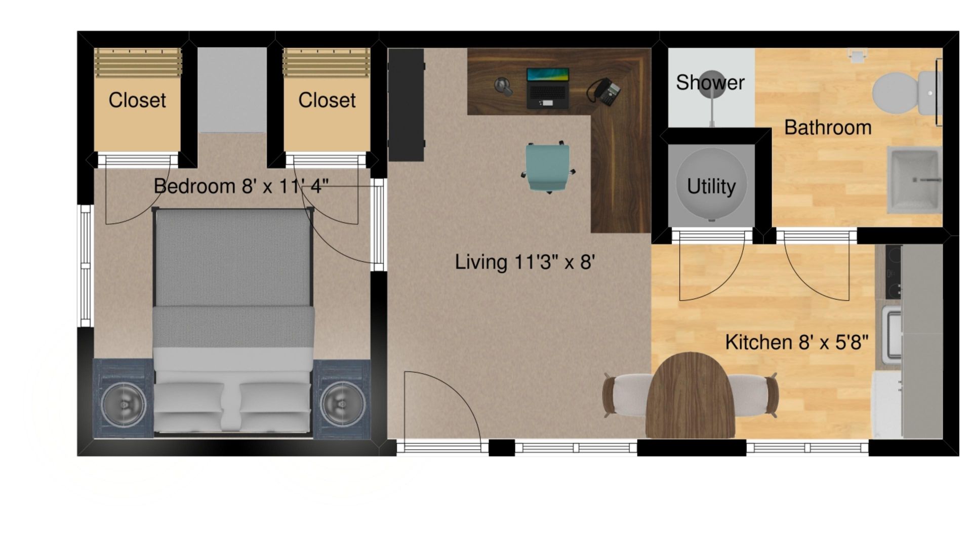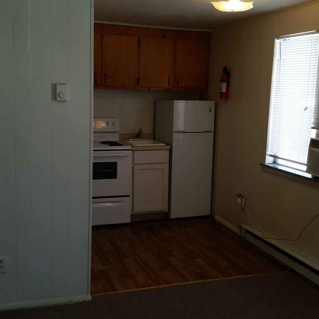 These 1 bed 1 bath apartments have a built-in dresser in the bedroom flanked by a closet on either side. Comfortable living room with air-conditioning and a fully equipped kitchen. Laundry room available just across the street.